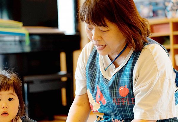 「和」を大切にする働きやすい環境。3年前より時短勤務させていただけるようになり家庭と仕事の両立がしやすくなりました。私自身の子育ては終わっていましたが、今孫の世話を任されるようになり9時間勤務は難しくなったからです。だからと言って好きな仕事を辞めるのは嫌だと悩んでいた時に時短の制度が出来たことを聞いてすぐ取入れさせていただきとても有り難く思っています。時間が短くなったことで、要領よく時間内で仕事を終えられるようにすることが難しかったり、苦手なパソコンと向き合いながらブツブツと独り言を言ったりしてしまうのですが、そこはほっておかず声をかけてくれたり手を差し伸べてくれる職員の皆さん!本当に優しい人ばかり! 私からは、子育て孫育ての経験を通して保育のアドバイスやヒントを話したり相談に乗ったりはできますが、周りの職員の皆さんに助けてもらう事の多いこと!この助け合い、協力のし合い、皆でこの園をよくしていこうという「和」を大切に働きやすい環境にいる自分が幸せだなといつも思っています。